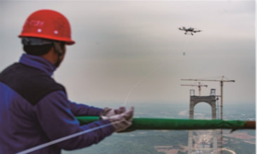 兩岸主塔均已封頂先導(dǎo)索是直徑2mm的杜邦絲就緒無人機放飛過江全神貫注無人機帶著先導(dǎo)索接近北岸主塔塔頂&em... ...