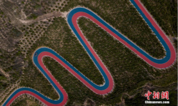 5月7日,山西省太原市,無人機航拍西山旅游公路一段彩色路面。這段公路鋪設(shè)了紅藍兩色瀝青,為當(dāng)?shù)嘏e辦國際公路自行車...